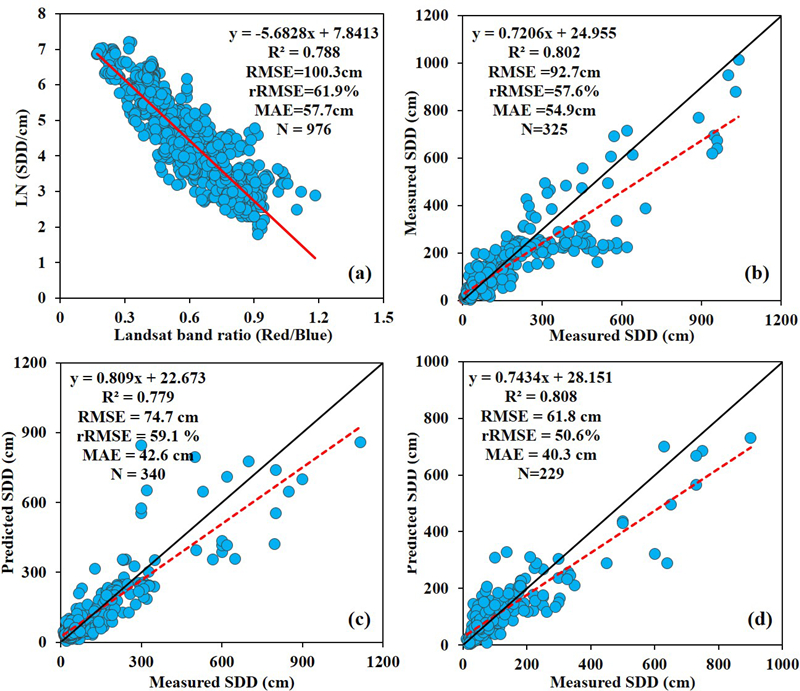 图1 基于三种实测透明度数据集和Landat TOA反射率构建、验证中国湖泊透明度反演模型,(a)2004-2018年实测透明度数据集的3/4用来构建模型,(b)1/4用来验证模型,(c)2007-2009年湖泊调查实测透明度模型验证,(d)1985-1990年第一次湖泊调查实测透明度模型验证。